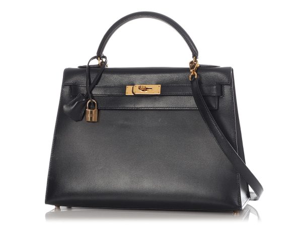 $328.00This structured, Sellier-styled Hermès Vintage Navy Blue Box Calfskin Kelly 32 is elegant in a larger size! Accessorized with gold-tone feet and hardware, it has a flap that opens with a turnlock that can be secured with the padlock whose keys are stored in the leather clochette. Tonal leather lines…