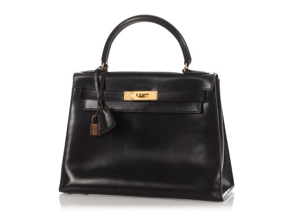 $328.00Hermès’ Vintage Black Box Calfskin Kelly 28 is a structured stunner with decades of turning heads on its resume! Crafted from glossy black calf leather with crisp Sellier construction, it’s paired with gold-tone hardware in the feet, turnlock, padlock, and keys tucked in the leather clochette. Beneath the top handle…