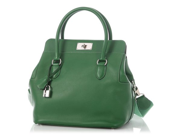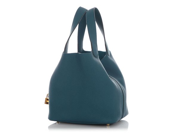 $328.00Hermès’ Vert Bosphore Clémence Picotin Lock 22 is a square-shaped little tote inspired by a horse’s feed bag! Made from blue-green leather with gold hardware, it features a 6-inch handle drop and secures with a leather strap and padlock that cinches the open top. The unlined, pocketless interior has a…
