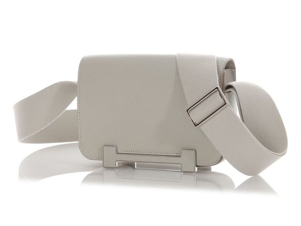 Hermès’ Gris Perle Chèvre Geta is a dreamy gray crossbody with Constance tendencies! The long flap is secured with an elongated palladium H magnetic clasp that also acts as a platform, replacing the feet. It opens to a tonal leather-lined interior with three slide pockets and the adjustable webbing strap…