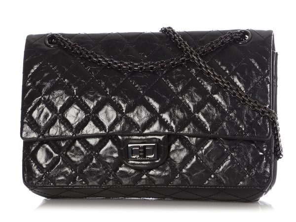 Totally cool-looking, Chanel’s So Black Quilted Calfskin 2.55 Reissue 226 has a glazed-leather treatment that makes it glisten and gives it a bit of an appealing squished look! The first flap opens with a black Reissue turnlock to reveal a zippered pocket on its underside and a slide pocket beneath…