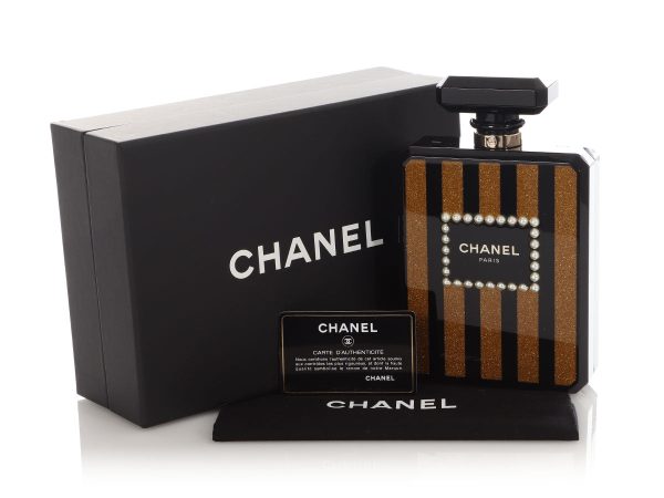 This Chanel Plexiglass Perfume Bottle Minaudière is a hard-cased evening bag with a hinged bottom! Shaped like a Chanel perfume bottle, it is inlaid with faux pearls surrounding “Chanel Paris” on the front and opens by pushing on the top clasp to reveal a gold-leather interior with no pockets. The…