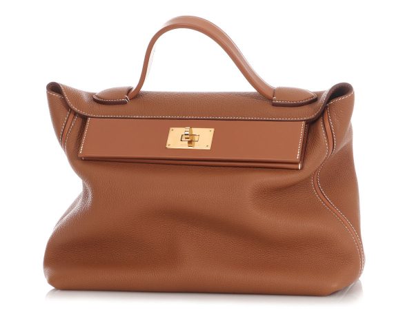 Hermès’ Gold Togo and Swift 24/24 35cm is a white-stitched roomy, casual, slouchy bag! It’s paired with gold-tone hardware in the turnlock that secures the hard flap and opens it to a tonal leather interior with one zipped pocket, while a slide pocket occupies the back face. The flat handle…
