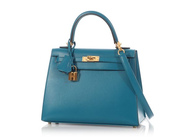 Hermès’ Bleu Izmir Tadelakt Kelly 25 is striking in a color that matches the Aegean coast of Turkey! Tadelakt is a smooth, soft, structured leather perfect for this Sellier-styled top handle paired with gold-tone feet and hardware in the turnlock, padlock, and keys kept in the leather clochette. The flap…