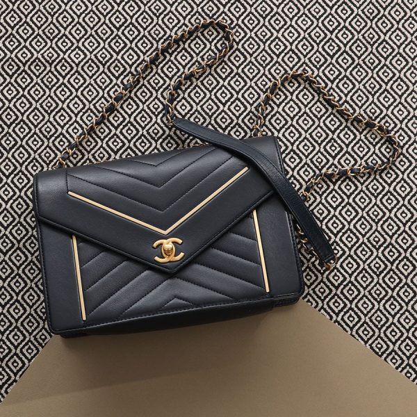 $238.00This Chanel Navy Calfskin Reversed Chevron Envelope Flap Bag is a visual stunner! The body is mostly chevron quilted with smooth-leather trim, while the envelope flap and front face are highlighted with antiqued-gold metal lines and a CC logo turnlock. The navy-leather interior has one zipped and two slide pockets,…