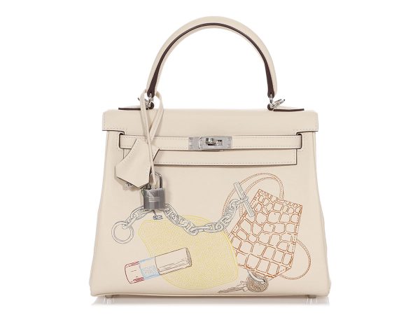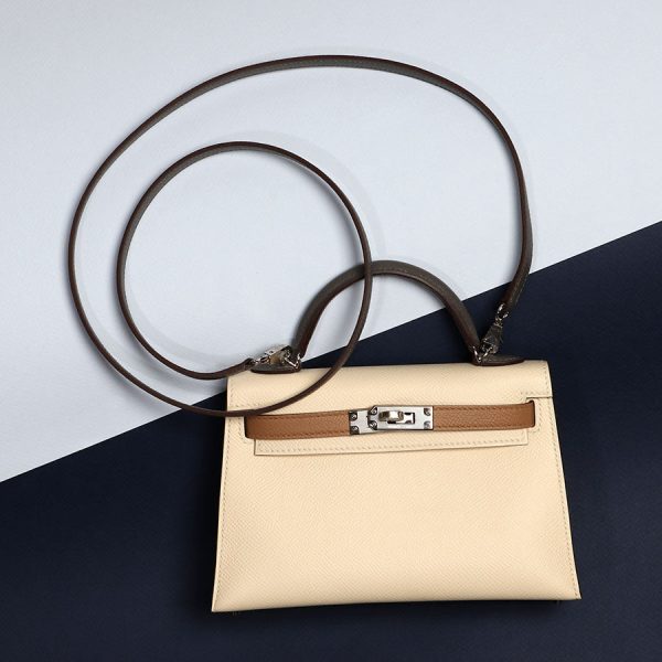 This beautiful Sellier-styled Hermès Kelly 20 presents in a tricolor of Nata, Gris Meyer, and Chai Epsom leather! The Nata body is paired with Chai sangles, and a rolled leather handle with a 1.75-inch drop and detachable leather shoulder strap in Gris Meyer. The bag gets just the right tweak…