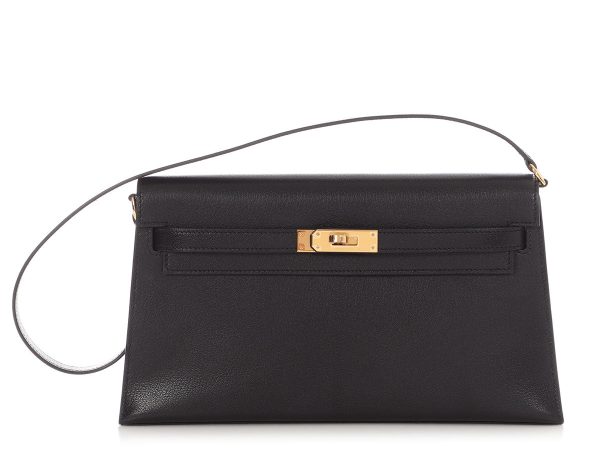 Hermès’ Noir Chèvre Kelly Elan is an undeniable beauty that can be worn as a clutch or shoulder bag thanks to its removable leather strap with a 10.25-inch shoulder drop! This Sellier-styled bag is paired with gold-tone hardware in the turnlock that opens the flap to black-leather lining with one…