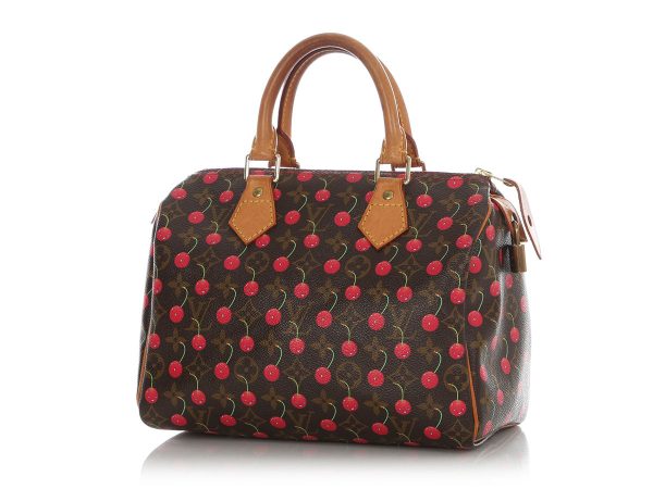Louis Vuitton’s Monogram Cerises Speedy 25 is a playful collector’s piece from the early 2000s collaboration with Takashi Murakami! Crafted from classic brown monogram canvas adorned with smiling cherries, it features natural leather trim and gold logo hardware. The top zips closed, and dual rolled handles with a 3.5-inch drop…