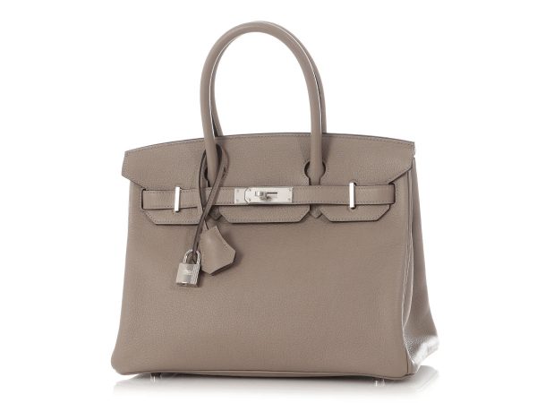 $328.00This creamy-dreamy Hermès Birkin 30 is a white-stitched beauty in Gris Perle Togo and it’s brand new from 2022 (U stamp)! Gold-tone feet and hardware are represented in the turnlock, padlock, and keys stashed in the leather clochette so as not to lose them. The flap opens to matching-colored-leather lining…