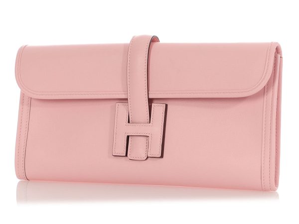 $328.00Hermès’ Rose Sakura Swift Jige 29 is a blushing beauty in cherry blossom pink! Crafted from Swift leather without any hardware, this sleek clutch secures with a flap that slides through the signature H tab. The interior is lined in matching leather and free of pockets, keeping the silhouette streamlined.…
