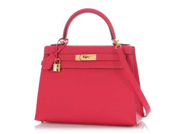 $328.00This structured Sellier-style Hermès Rose Jaipur Epsom Kelly 28 is beautiful in a coral-pink color! It’s paired with gold-tone feet and hardware of the lockable turnlock that opens the flap to tonal-leather lining with one zipped and two slide pockets inside. In pristine condition and stamped with an A, it…