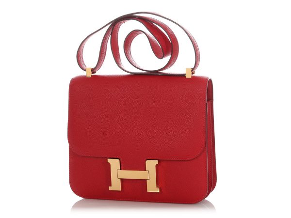 $328.00This handsome Hermès Rouge H Epsom Kelly 28 is a little more formal thanks to its Sellier styling! It’s paired with gold-tone feet and hardware in the turnlock, padlock, and keys kept in the leather clochette. The interior is lined in matching-colored leather and has one zipped and two slide…