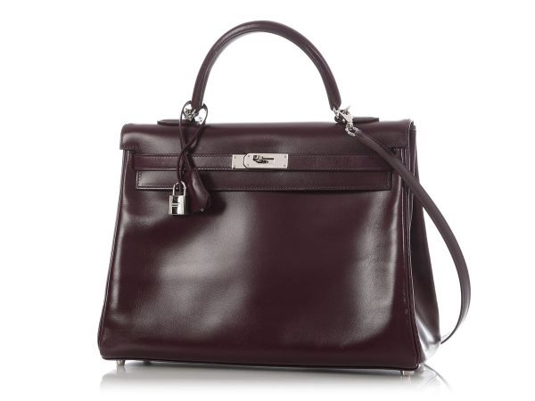 $328.00This Hermès Raisin Box Calfskin Kelly 35 exudes sleek sophistication! The shiny, smooth Box leather is paired with palladium hardware, and the flap’s turnlock can be secured with the padlock and keys kept in the leather clochette. A tonal leather interior has one zipped pocket and two slide pockets to…