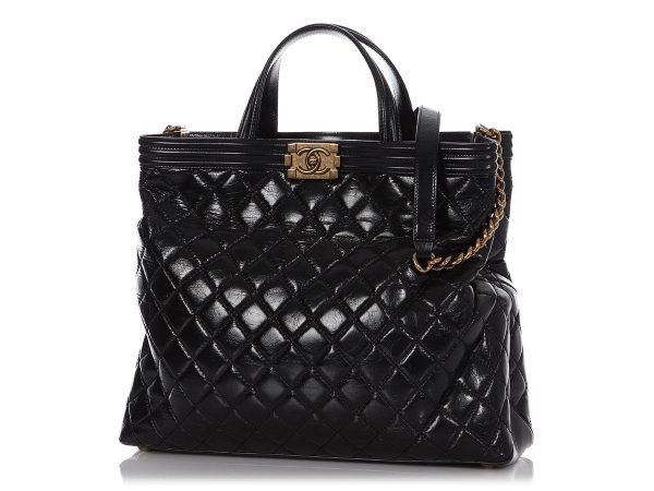 Chanel’s Large Black Quilted Glazed Calfskin Boy Shopping Tote is a versatile stunner that can be used for more than retail therapy excursions! It’s paired with antiqued gold feet and hardware and features an open top with a leather tab that goes through the front to a push-lock Boy clasp.…