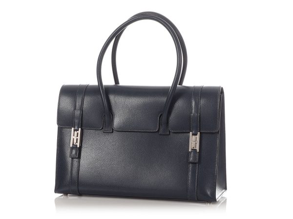 $328.00This structured, Sellier-styled Hermès Vintage Navy Blue Box Calfskin Kelly 32 is elegant in a larger size! Accessorized with gold-tone feet and hardware, it has a flap that opens with a turnlock that can be secured with the padlock whose keys are stored in the leather clochette. Tonal leather lines…